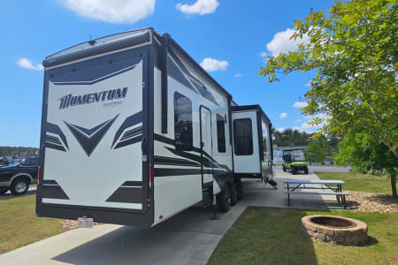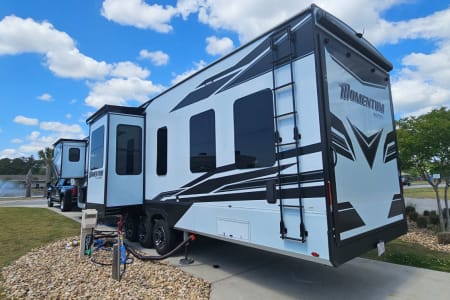 Welcome to your mobile luxury suite – the 2024 Grand Design Momentum 414M is the perfect fusion of rugged functionality and high-end comfort. Whether you're headed to a beach retreat, mountain getaway, or action-packed motorsports weekend, this toy hauler is your all-in-one vacation headquarters.