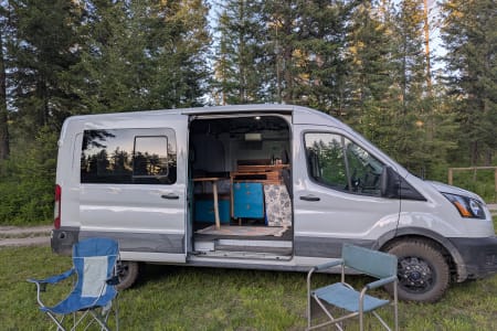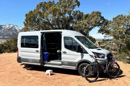 This is Sage. She earned her name during our desert travels and I cannot say enough good things about this van. This 2023 Ford Transit AWD is still in the building phase, however it is equipped with everything you need for a great camping experience.
