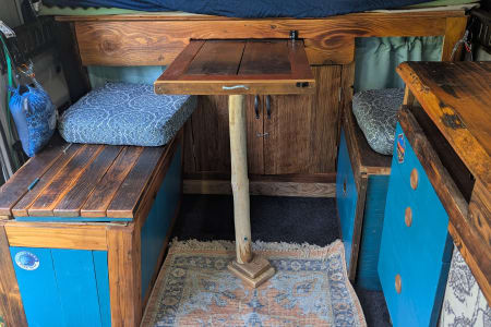 Built for 2 travelers, it has a comfortable bed, Mr. Heater, functional sink, cook stove, and lots of room for storage. Its basic design and layout has the outdoor enthusiast in mind by utilizing functionality the over extra editions that can weigh a van down. It has newer 10 ply tires, drives sweetly down the highway and gets good gas mileage.