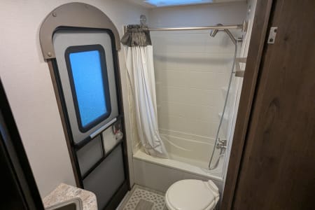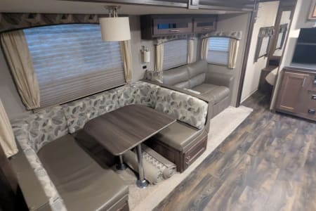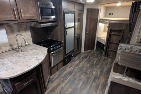 Inside, you'll find a spacious layout with plenty of room for everyone to spread out and relax. The open-concept living area features a large slide-out, a cozy sofa, a booth dinette (both convertible for sleeping), and a fully stocked kitchen with everything you need — including a refrigerator, microwave, stove, and oven.