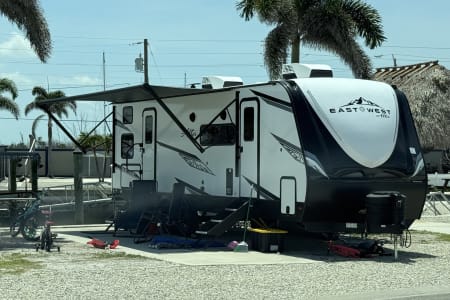 No tow vehicle? No problem. We deliver and set up within 130 miles of Port Saint Lucie. Show up, relax, and enjoy — we’ll handle the rest. Towing is possible with a 1/2-ton truck and brake controller (weight approx. 7,400 lbs dry).