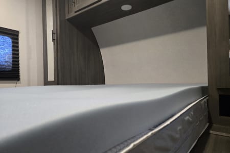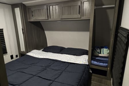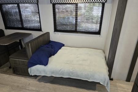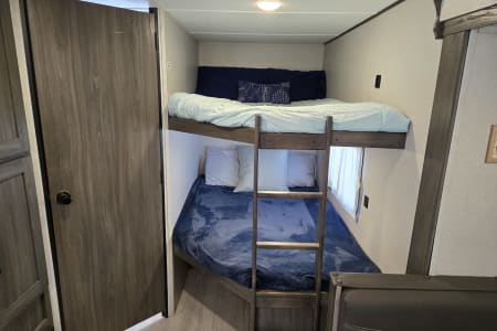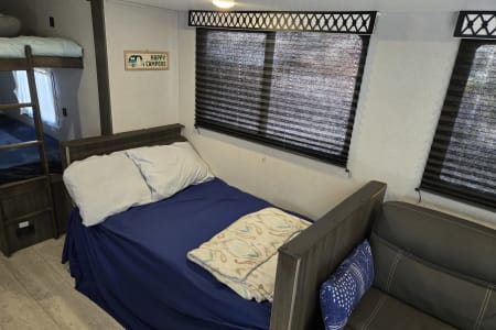 The trailer sleeps 8, with 2 full size bunks with lights. 2 Convertible beds, and a closed off bedroom with a queen size bed. There are outlets next to all beds including USB ports. The bathroom has a shower and separate door for outside entry.