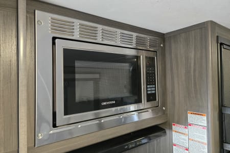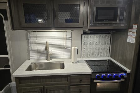 We also provide a Keurig coffee maker with coffee supplies stocked for your convenience. If you prefer to cook inside there is a beautiful 3 burner stove, oven and microwave, as well as a deep basin sink.
