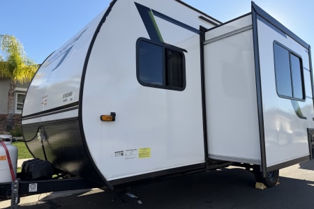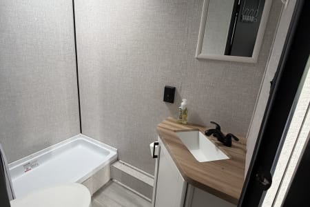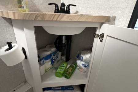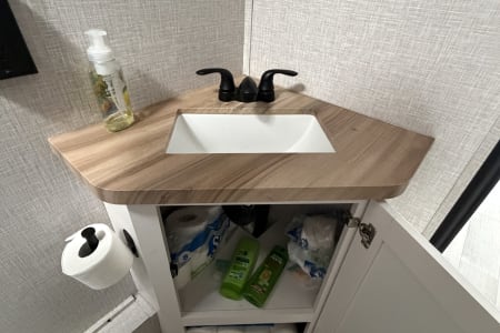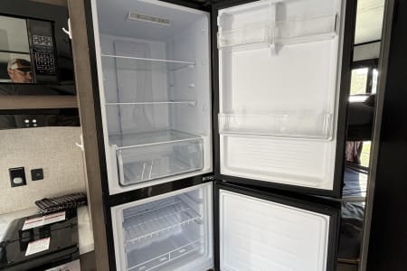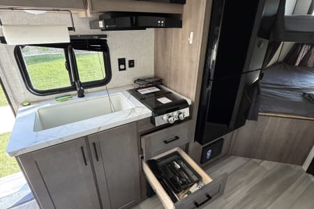 The kitchen has a two-burner range, large sink and microwave. There is also a quick connect setup for a provided outdoor skillet. There is a large fridge and freezer in the coach that runs off the 12v battery (we have solar too) and there is a outdoor mini fridge that runs off shore or generator power.