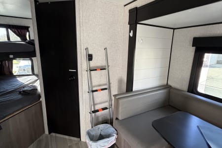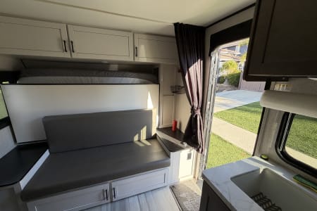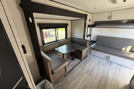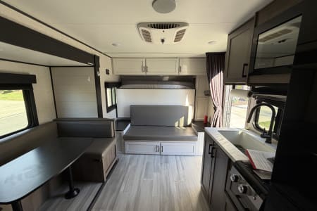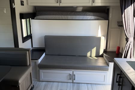 This spacious trailer comfortably sleeps 4 adults and two children with a queen-size Murphy bed that converts to a sofa, cozy double bunk beds, and a U-shaped dinette that also makes into a bed.