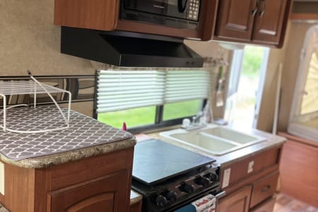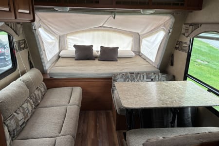 Sleeps up to 8. 2 queen fold outs. Couch and dinette conversion. Kitchen and bath. Refrigerator powered by either electric or propane. Brand new floors. Heat and A/C. Generator rental available for an additional $25 a day. Electric awning. Coffee maker and cooking utensils included at no extra cost. Full linens provided for the two queen beds. Has dvd player but you would need to bring small tv. If we need to fill the water tank that’s an extra $50.
