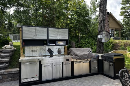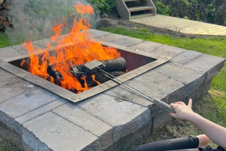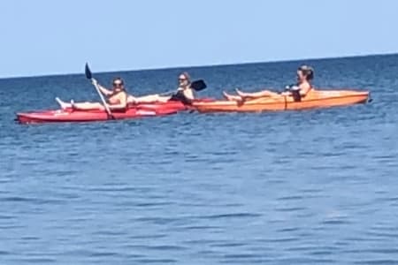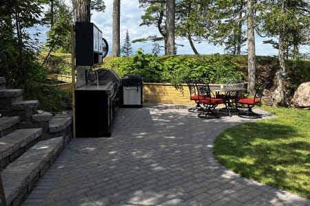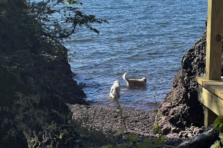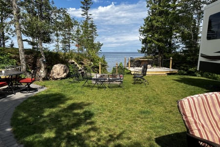 Simply Marvvv-oulous! Set roughly 5 feet below our yard level and separated by a light tree line, this space feels truly unique and calming especially in the height of the summer lushness. Here, you will have access to an upscale outdoor kitchen, custom paver patios with outdoor furniture, a private fire pit complete with tools and supplies, an outdoor breakfast area built atop of the legendary large tree stump with a deck and direct view of the cove, freighters, and priceless sunsets. You will have an outdoor sink, outdoor shower sprayers on the Camper, and access to our Wifi. With approval, we welcome a furry friend and offer pet leash safety hooks outside the camper and in the lawn. NOTE: We have two golden doodles on property who roam freely. They do not jump and are not known to take food. They love people and are loved back by most :)