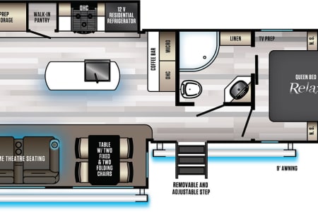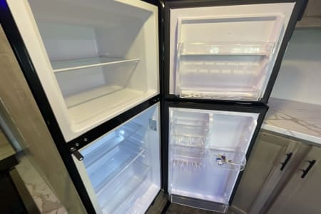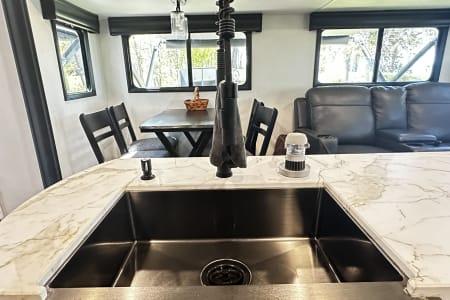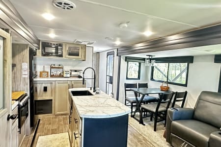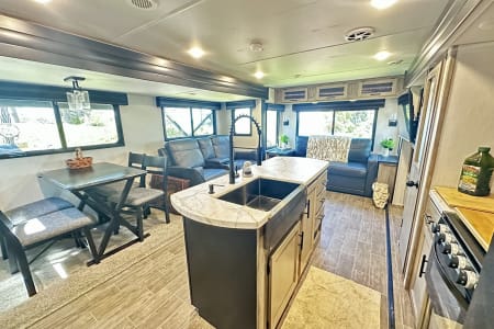 Living Room: This is where it gets really good! :) With two full room slide-outs in the main living area, you are set for spacious comfort regardless of the weather outside! Speaking of outside... did I mention there's the option for a tv out there too?!? Back to the living room... two theater style recliner seats with massage and heat, an electric fireplace for the right ambiance, and additional couch that does pull out (but why...) and a large screen smart TV with bluetooth speakers.