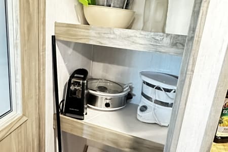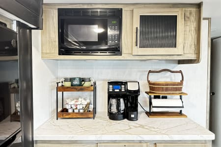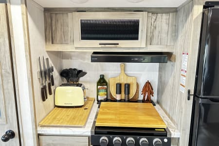 Kitchen: LOVE THIS LAYOUT! There is a WELL STOCKED coffee bar located to your right immediately upon entrance. I've got you covered! We've also provided all the basics needed to function efficiently in the kitchen or out at the grill and griddle. The fridge is 11 cubic feet (!) and there is a walk-in pantry for longer stays. Beautiful Island and table seating for four.