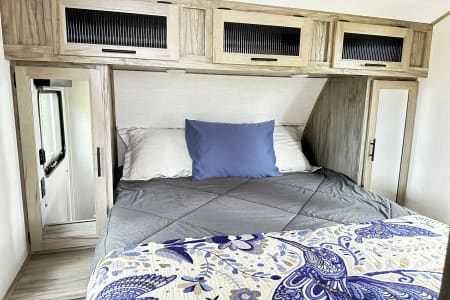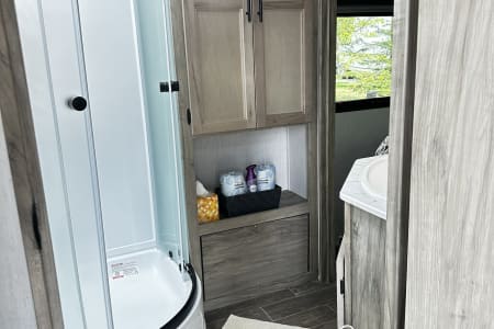 Bathroom: Unlike most campers, this one comes with a higher PORCELAIN toilet!! It also has a skylight in the shower and a large cabinet for added storage. Here you will find all the towels and bathroom products needed for your stay. It is a walkthrough bathroom, which makes it easily accessible from anywhere in the unit and directly off the main door for outside access as well.