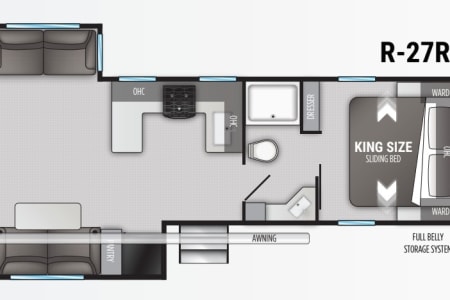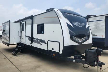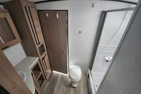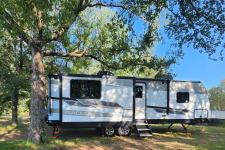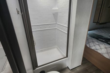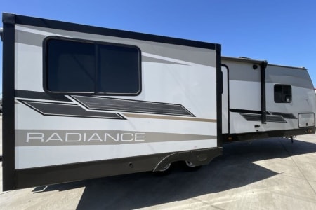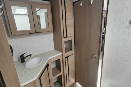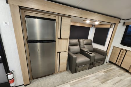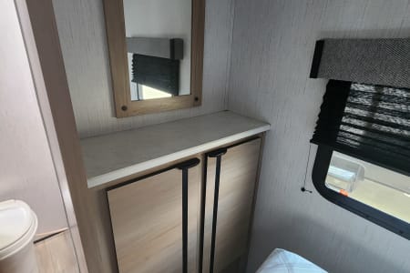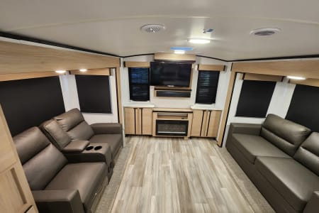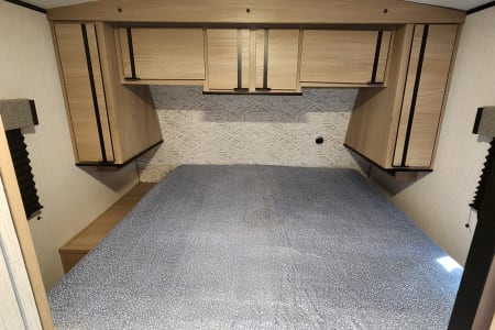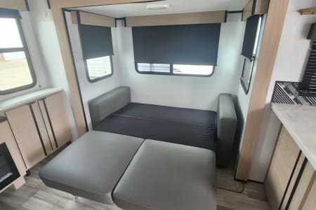 This is a beautiful 4 person camper with SO MUCH STORAGE!!!! The kitchen is absolutely fantastic with a HUGE U shape, great for 2 people to cook and prep meals together! The living room is an open, large space for hanging out and the entertainment center is fabulous!! The pullout sleeper sofa is great for that extra guest(s) to sleep!! The king size master bed is a dream, with the connected over sized bathroom!!!