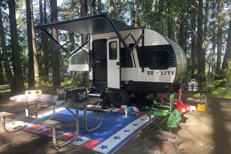 Thank you for considering our 2025 Skybreaker. The trailer is a wonderful weekend warrior. We purchased the Skybreaker because our vehicle has a limited tow capacity. This little trailer is ready for big fun! The trailer weighs 2300 lbs, and it is only 14 ft long, which makes it very easy to tow. It has a toilet and a shower! It is perfect for a small family of 4 or fewer. The large bed is ideal for adults, and the fold-out bed is excellent for young children. You have everything that you need for a perfect outdoor escape.