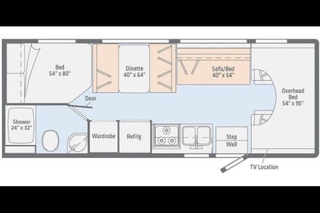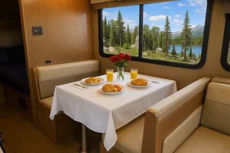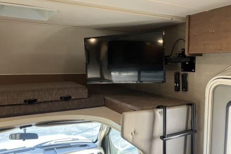 1 RV queen bed, 1 pullout sofa/bed, 1 full-size dinette bed, and 1 full-size cab-over bed.