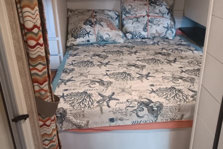 Sleeps up to 6, with a queen bed, dinette sleeper, and large overhead bunk