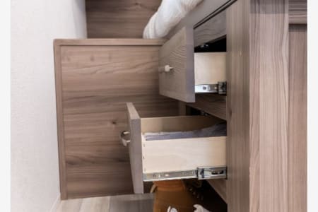 Double dresser drawers on both sides of the bed and an under-bed storage area that includes two removable storage totes with lids—perfect for keeping camping gear organized.