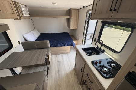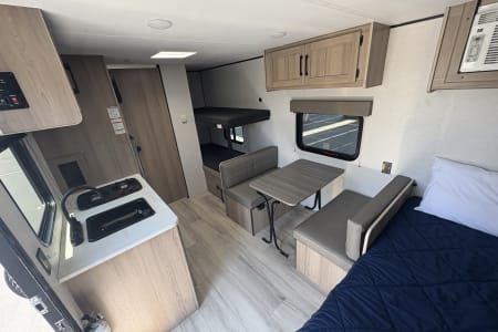 BRAND NEW 2025!!! All the Comforts of a Travel Trailer but easy to tow and affordable. Queen Bed, 2 Bunk Beds (300 Lbs Capacity), Dinette Table Bed, Wall Mounted TV, Wall Mounted AC, 2 Burner Kitchen Cooktop, Wardrobe Storage Closet, Hidden Storage under Queen Bed, 6'6 Ceiling. Large Under Sink Storage, 3.3 Cu Ft, Refrigerator 12 Volt, Instant On Demand Water Heater, 6'1 Shower Height, Nice Size Bathroom, Full Pass Through Storage, Portable Solar Ready, Power Awning, Outside Electrical Outlet.