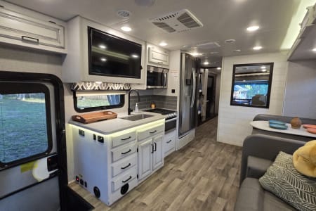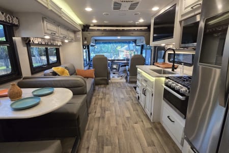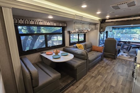 - Living: Couch & Dinette, swivel cab seats, smart-TV (stream via your hotspot), ample lighting, outlets