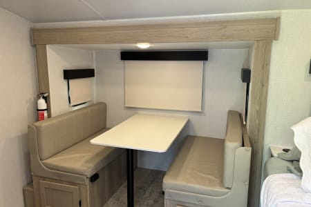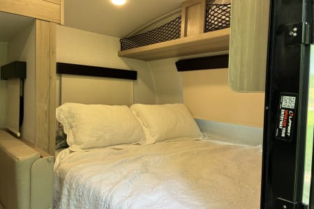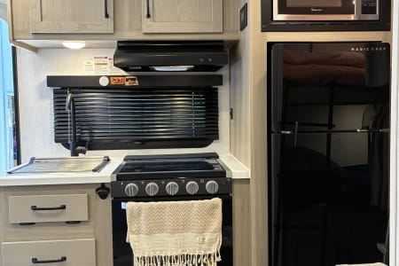 If weather is nice, within the exterior storage, 3 camping chairs and foldable picnic table/chairs can be found with a griddle that can be enjoyed outside by the 14' power awning. It also has a bike rack available upon request for those looking to ride during their camping. The camper runs on 200W solar panel and a 1800W inverter (2 deep cycle batteries) to go have some off-grid fun with!