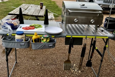 •This unit includes a Blackstone propane griddle that attaches to the camper. Or, if you prefer, we offer a fantastic grill and grilling table with all the accessories you could possibly want for an additional fee. Check it out in the photos!