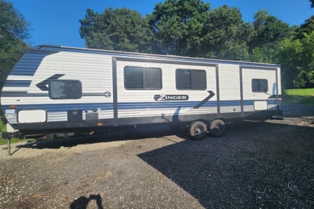2021 Crossroads Zinger. It comes equipped with a king sized bed in the rear bedroom, queen bunks in the front bedroom, refrigerator, farm sink, microwave, stove/oven, air conditioning, heat, full bathroom with stand up shower, power retractable awning, outdoor speakers, outdoor "kitchen", 4 tv's, bluetooth sound system and more! We have worked hard to try and outfit this trailer with everything you would need to have a great time camping. Please feel free to ask any questions that you may have.