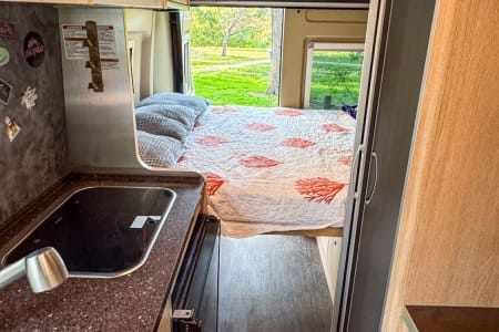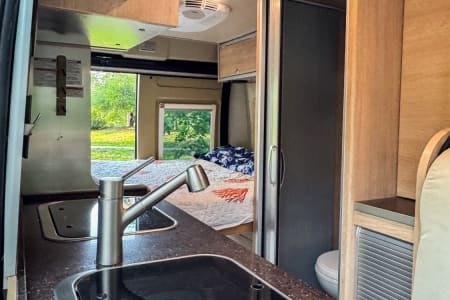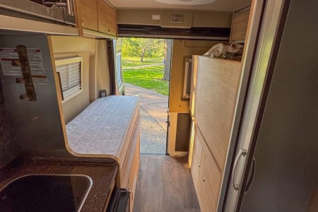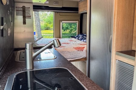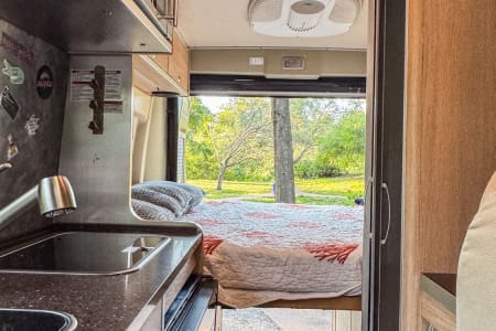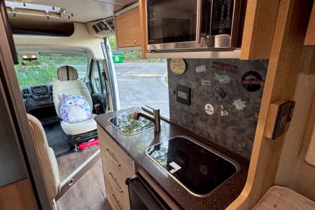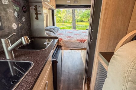 Kitchen: Equipped with a 2-burner propane stove, stainless steel sink, microwave, and compact refrigerator