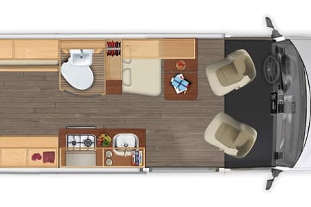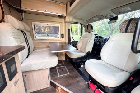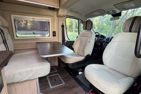 Additional Amenities: Vinyl flooring, pedestal table, and ample storage compartments