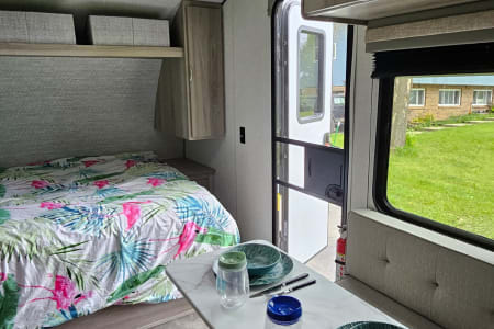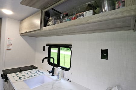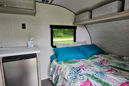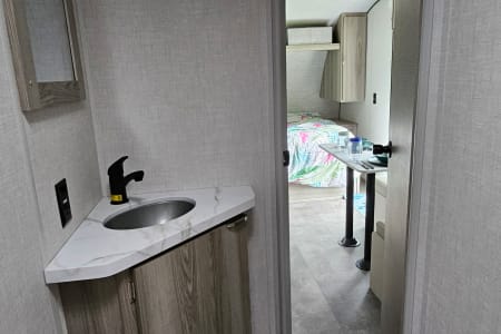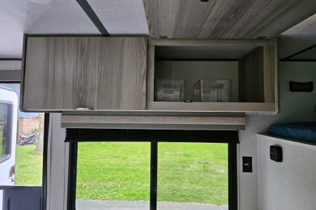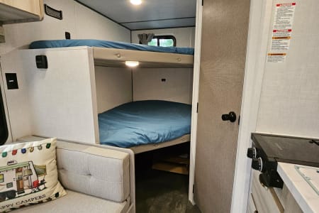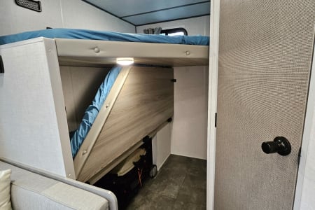The kitchen has a fantastic amount of counter space and ample storage up high if you need to keep certain snacks out of the reach of little ones. The 4.6 cubic foot refrigerator/freezer combo is larger than most of the short fridges and will give you plenty of room for groceries. There is also a 2 burner stove, sink, and an ice machine for your convenience. The unit also has AC and black blinds to hopefully help the kids sleep a little longer before you head out for a day of fun in the sun!