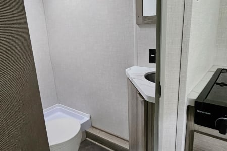 The full bath has a shower, toilet, sink, exhaust fan and mirror (you'll be surprised how many campers don't!).