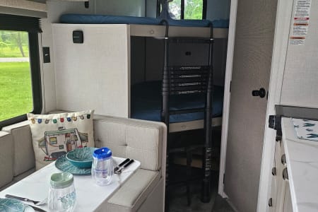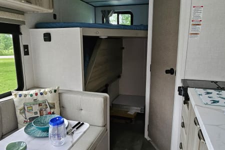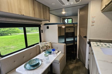There is an L shaped dinette perfect for game time, and you can bring in a camp chair or two if you need additional seating around the table.