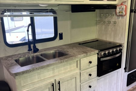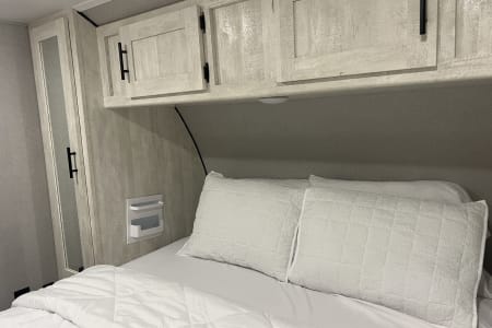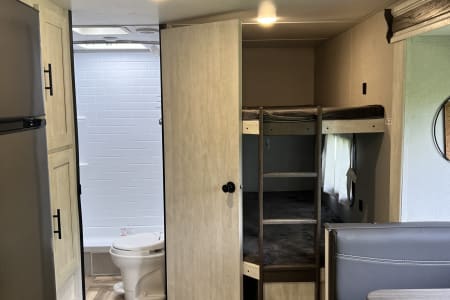 - Full Bathroom: Enjoy the convenience of a spacious shower, toilet, and sink—no need for campground facilities! *SMALL PACK OF RV SAFE TOILET PAPER PROVIDED + LINENS*