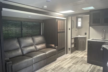 Getting back to nature & family time with modern day conveniences in this 2023 stylish RV such as Shower, toilet, Heat, AC, Large refrigerator, stove & comfortable seating & beds!