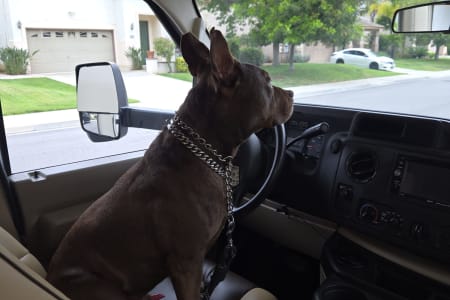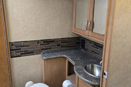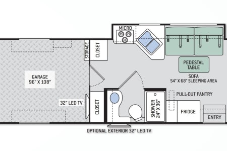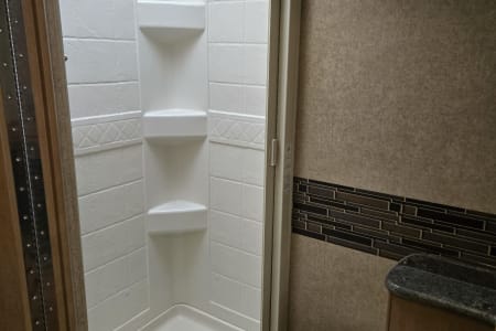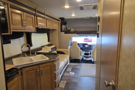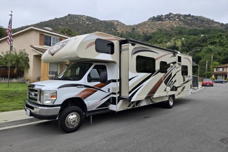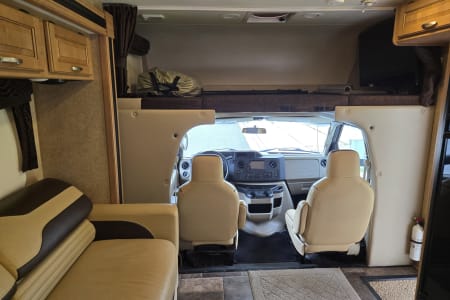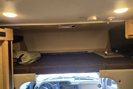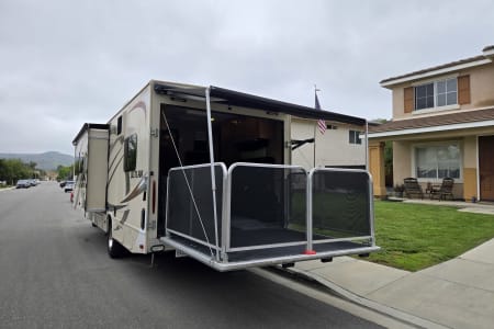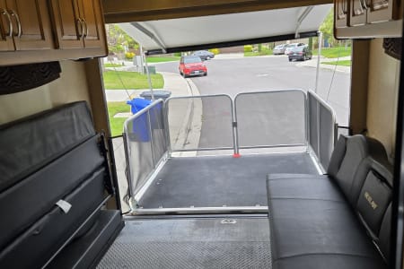 There is a full size bed above the Captains' chairs, the couch folds out into a full size bed and uses an air mattress, and in the garage are more beds that can be used as benches, two small beds, or a single large bed. You can leave the back patio open all night or close it up and run the air conditioner. It even has an outdoor shower.