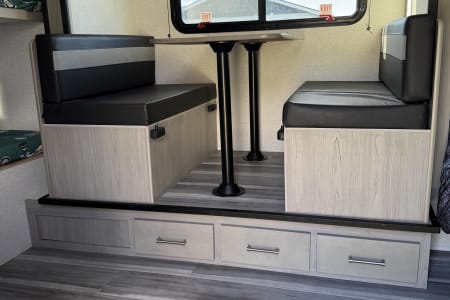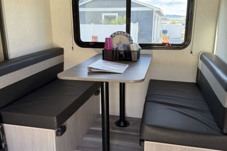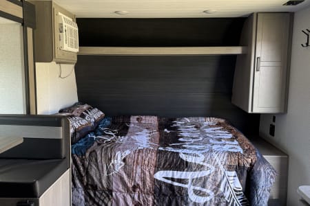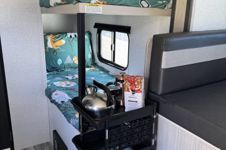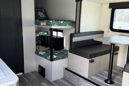 Family-Friendly Fun: With cozy bunk beds for the kids and a comfortable queen bed up front, this trailer can happily sleep a family of 4-5. The dinette also converts into an additional sleeping space, offering flexibility! All beds come with freshly washed fitted sheets and bedspreads. Bring your own pillow.