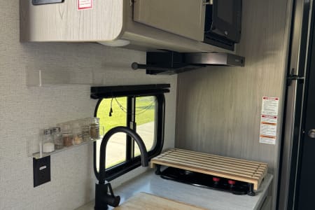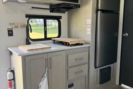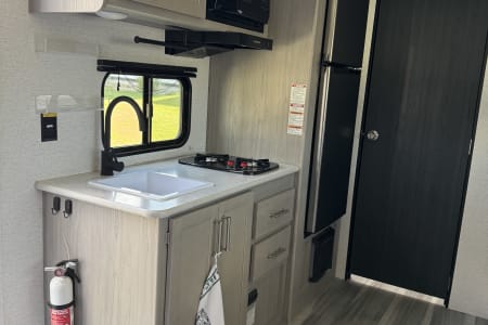 Fully Equipped Kitchen: Whip up delicious meals on the go with the compact kitchen, complete with a two-burner cooktop, microwave (only operational if plugged in), refrigerator (electric!), and sink. We will provide some full basic cookware, plates, cups, utensils, roasting sticks, kitchen towels, and cleaning products to get you started!