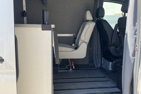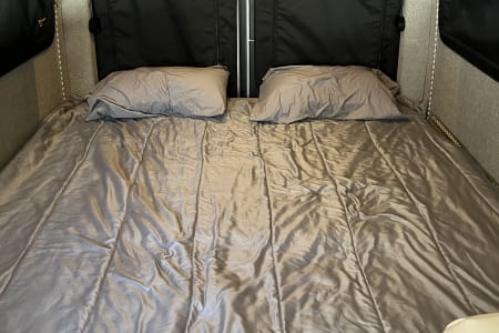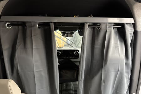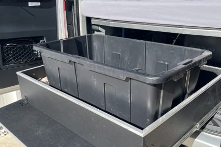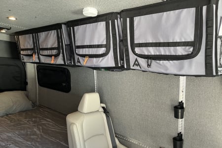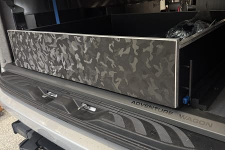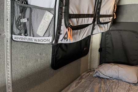 A MaxxAir Fan will keep the van ventilated. Blackout curtains for every window makes stealth camping easy. A spacious Dometic 12v refrigerator will keep your beverages cool and greens crispy. The slide out tray under the bed will accommodate large items and all the camping equipment you may need. Keep luggage and other items overhead in Adventure Wagon canvas storage bags.