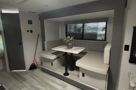 Sleeps 6 comfortably: Bunk beds, a convertible dinette, and a roomy queen bed.