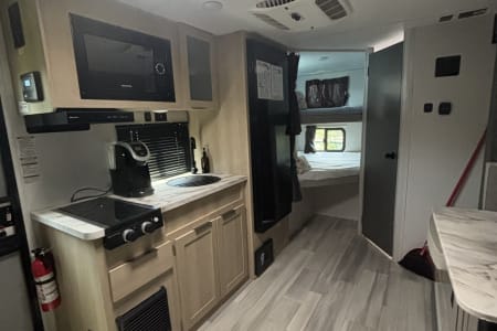 Fully stocked: Kitchenette, bathroom, A/C, and everything you need to cook, chill, and make memories.