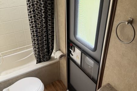 The bathroom is accessible from both the inside and outside and she's got an outdoor shower to boot!