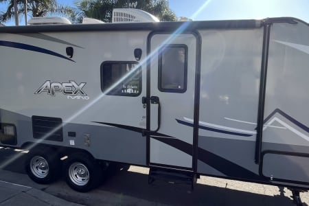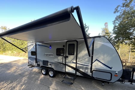 Introducing our 2019 Apex Nano Bunkhouse Travel Trailer, the ultimate family-friendly adventure companion. Designed to sleep up to 6 people comfortably, this travel trailer is equipped with everything you need for a home-away-from-home experience. The well-appointed kitchen comes with basic appliances, pots and pans, silverware, and more, ensuring you can prepare meals with ease. The spacious interior is further enhanced by a convenient slide-out, providing additional living space for relaxation and activities. Enjoy outdoor cooking with the built-in outdoor kitchenette, perfect for those sunny days and evenings under the stars. Enjoy the skylight above the bed at night and watch the stars from the comfort of the trailer. Weighing in at just 4,600 lbs,( Equipped for camping ) the Apex Nano Bunkhouse is the lightest in its class, making it easy to tow and maneuver. Very 1/2 ton pickup truck friendly. Please note, the trailer requires a 7-pin connector and trailer brake. Trailer uses a 2 5/16” ball for hitching. Ready to hit the road, this travel trailer offers a perfect blend of comfort, convenience, and versatility for your adventures.
