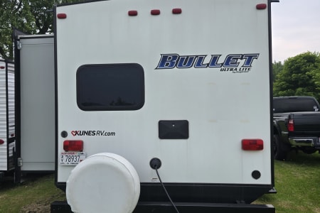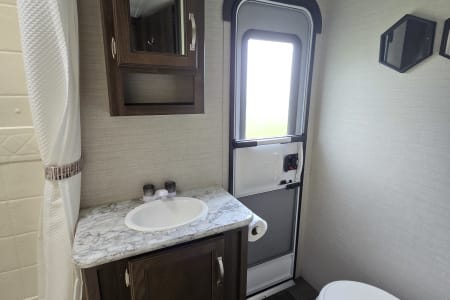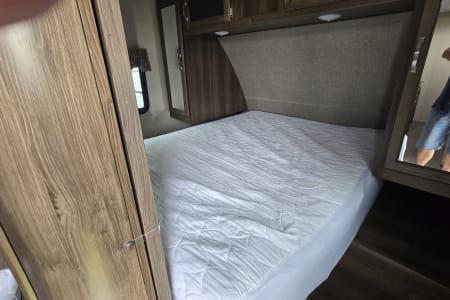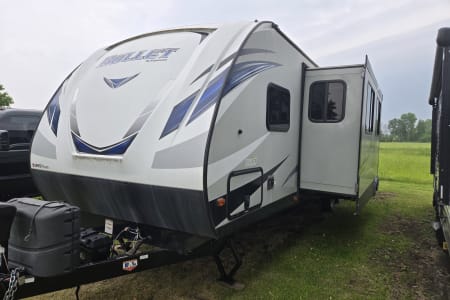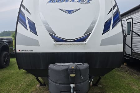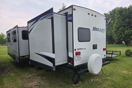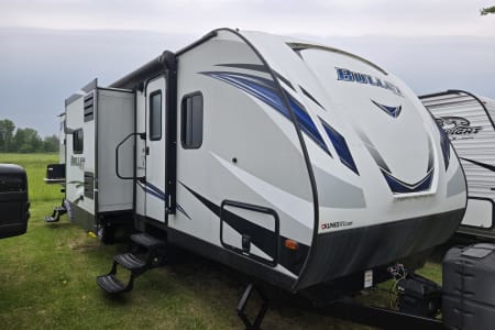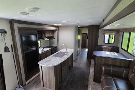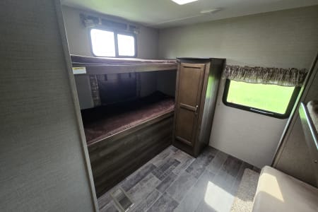 This camper is a 2018 camper. It is 31 ft and comfortably sleeps 6 but can sleep as much as 10. There is a separate back room with bunks. It is very clean and well taken care of. Power awning and built in speakers.