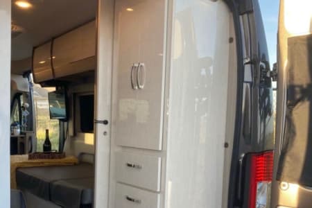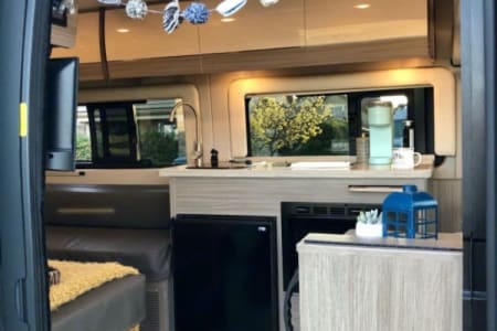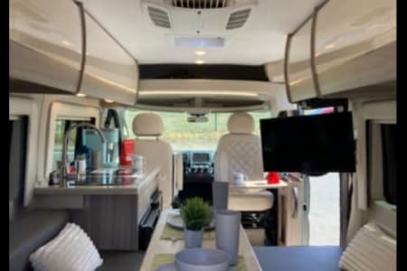 Enjoy off-grid adventures with peace of mind thanks to an Onan 2800-watt gas generator, two powerful 12V AGM house batteries, solar panels, and a robust 1,000-watt inverter. Climate control is effortless with integrated air conditioning, heating, and reliable hot and cold water supply. Additional comforts include a 24-inch TV, Bluetooth-enabled sound system, and AM/FM radio for your entertainment.