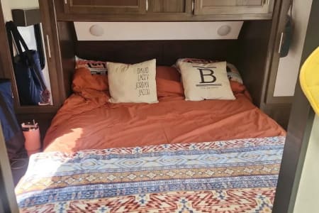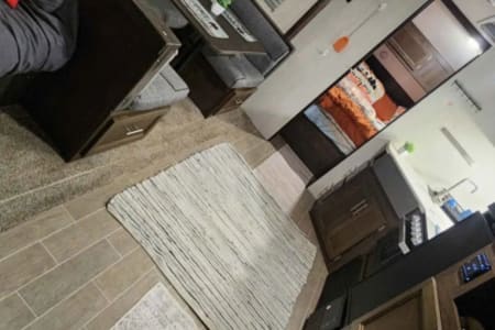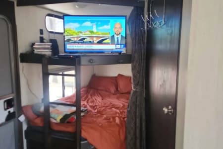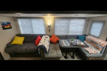 This is a great open floor plan with bunks in the rear for the kids. This camper is 33' long and has 1 slide so there is plenty of room. Dinette and booth also turn into beds. Bath tub for the little kids is great. Queen bed up front in a separate room for privacy. Electric awning with led lights. Half ton towable, We include kitchen stuff with plates and silverware for cooking including cast iron for over the fire, towels, and bedding included, let me know age and sexes of kids and I'll try and get fun stuff for them. Chairs and mat for outside. Everything you need for a great get away. Delivery is available if needed. Please ask before booking if delivery is needed. This camper Deliver's out of Des Moines area. Make sure you ask before booking on availability.