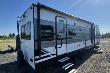 Very spacious living area, tv, recliners and pull out bed, large bathroom with tankless water heater for instant hot showers, queen bed in the master. Solar charging.