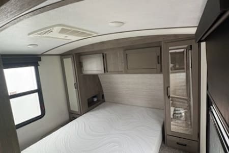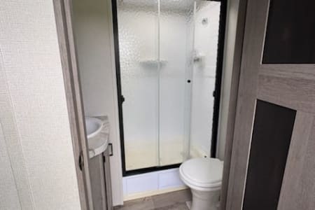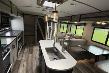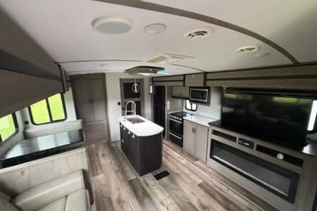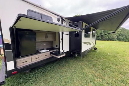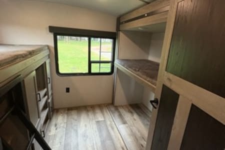 This spacious RV Boasts a queen bed in the front with a full bath. The living quarters has 2 comfy recliners. The island kitchen is complete with stove, oven, fridge, and microwave, and is fully stocked with small appliances, dishes, glasses and silverware. The rear has 3 twin bunks that will make any childs vacation dreams come true. This RV also has an outside kitchen as well!