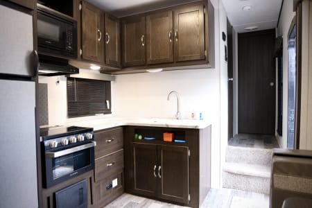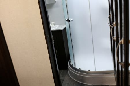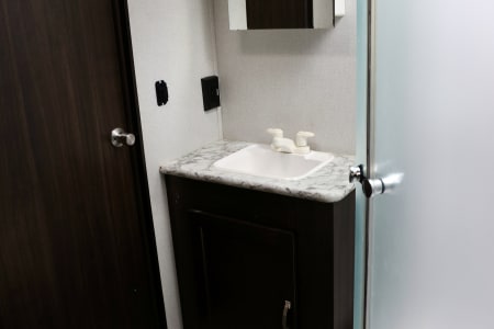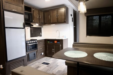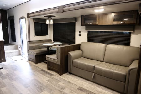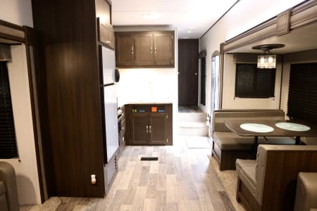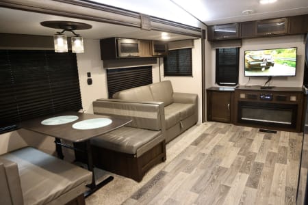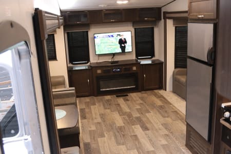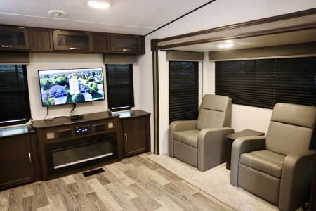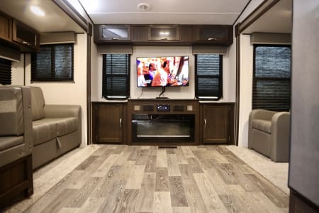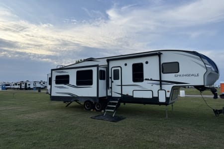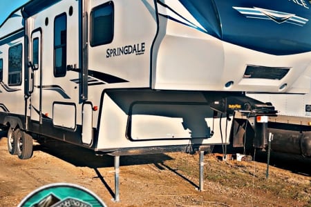 Springdale 253FWRE is a rear entertainment fifth wheel model known for its spacious living area with dual opposing slides. It features a large entertainment center as the focal point of the rear living space, often including a fireplace. The floorplan also includes a front master suite with a queen bed and a dual-entry bathroom.