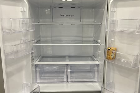 Full kitchen featuring a residential fridge, oven, microwave, and pantry