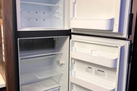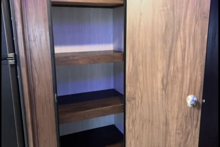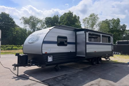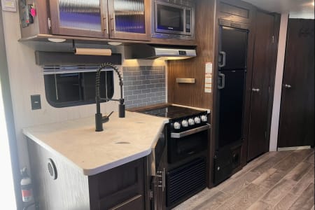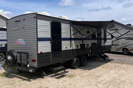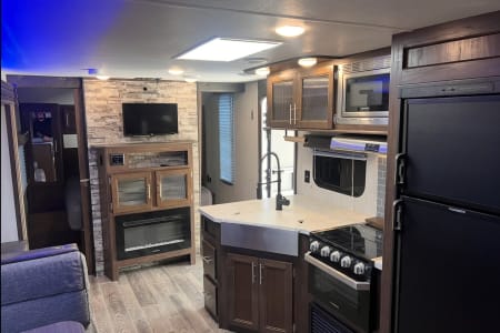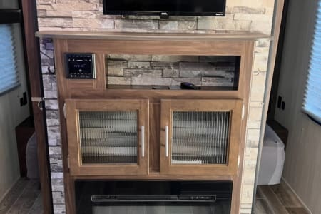 Relax in comfort with a cozy fireplace for secondary heat and a tankless 55K BTU hot water heater for endless warm showers. The large slide-out, topped with an awning, expands your living space, and dual entry doors offer easy access. You'll find tons of storage throughout, including a convenient front slide-out storage tray. Plus, we've updated the faucets for a touch of modern convenience.