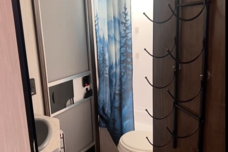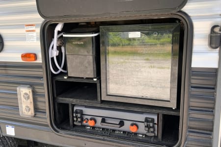 Step outside and enjoy the 16-foot power awning for shade and shelter. The outdoor kitchen is a highlight, equipped with a mini-fridge, a 2-burner griddle, and an ice maker – perfect for campfire meals. An outdoor shower is also available for quick rinses after a day of adventure.