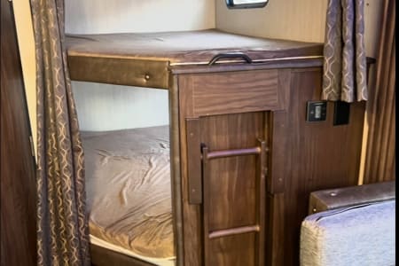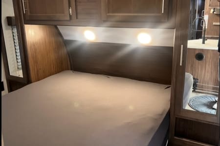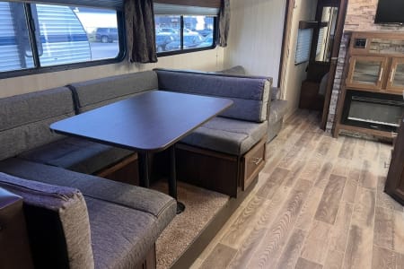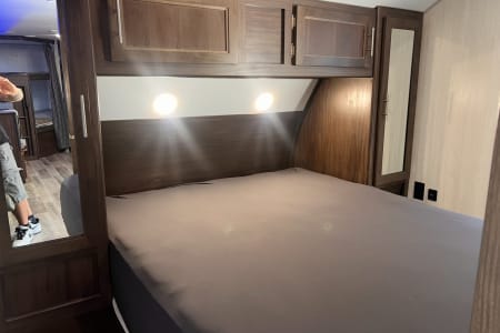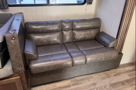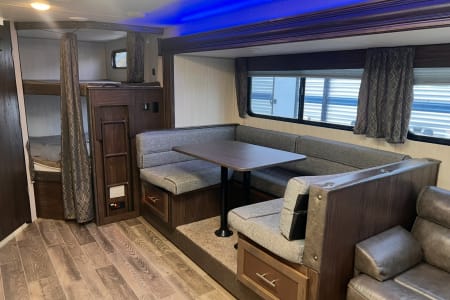 Discover your next adventure in our spacious RV, perfect for families and groups! This rig comfortably sleeps up to 10 with a front queen bedroom (featuring nightstands and closets), double bunks, a jackknife sofa, and a convertible dinette.
