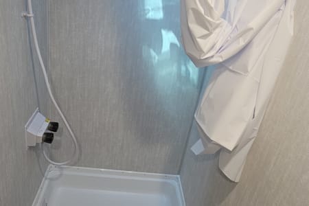 Full rear bath (24″×36″ shower, foot-flush toilet, tub/shower surround)
